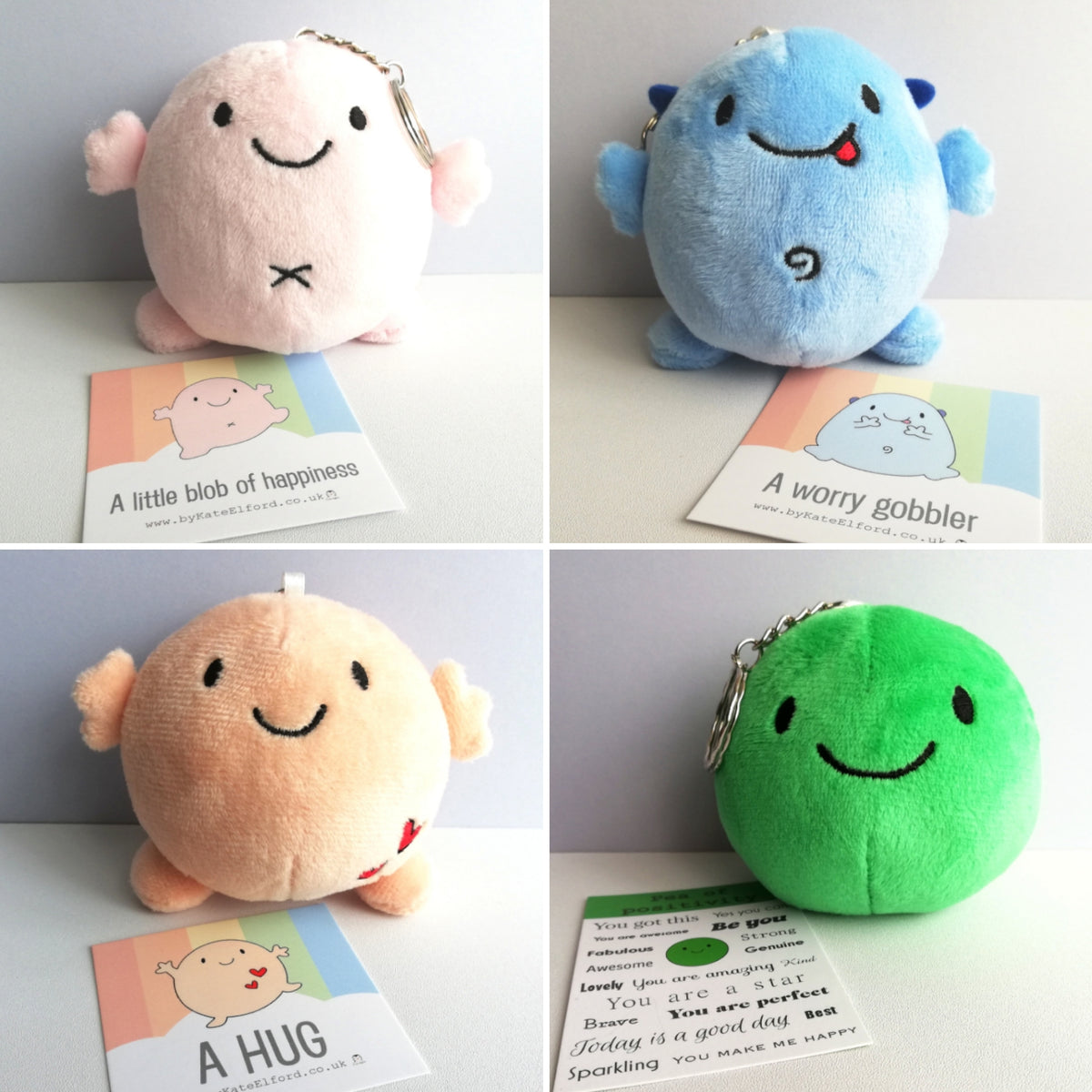 Plushie keychains. A blob of happiness, a worry gobbler, a hug and a pea of positivity. All filled with recycled stuffing.