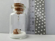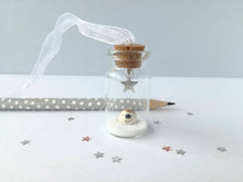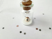 Miniature hand crafted ceramic Christmas hedgehog ornament. Little hedgehog is sealed in a glass bottle and has a silver colour star hanging above.