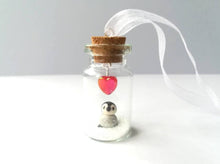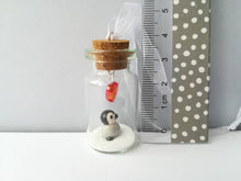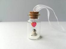 Little penguin is sealed in a mini glass bottle and has white glitter snow in the bottom of the bottle, and a red colored heart hanging above.