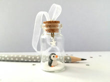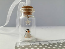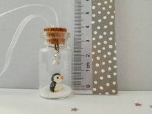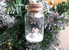 Miniature hand crafted ceramic Christmas penguin ornament. Little penguin is sealed in a mini glass bottle and has a silver star hanging above.