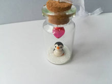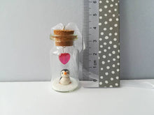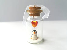 Miniature hand crafted ceramic gift. Penguin ornament. Little penguin is sealed in a mini glass bottle and has white glitter snow in the bottom of the bottle, and a clear red coloured heart hanging.
