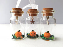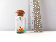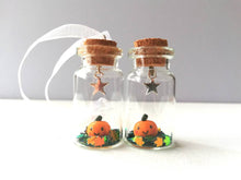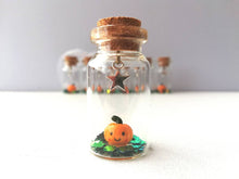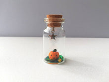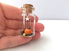 A little ceramic pumpkin sealed in a mini glass bottle with a silver coloured star hanging above.