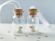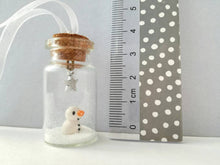 Miniature hand crafted ceramic Christmas snowman ornament. Little snowman is sealed in a mini glass bottle and has a silver star hanging above.