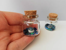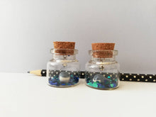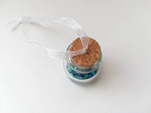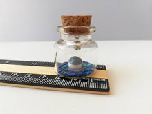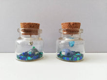 Little whale sealed in a mini glass bottle. There are two colour options light blue with a light blue heart, or dark blue with a star.
