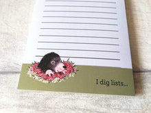 A blue and green notepad, with a mole design at the bottom and the wording I dig lists.