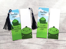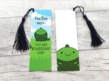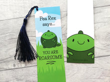 The writing on the bookmark reads Pea Rex says you are roarsome.