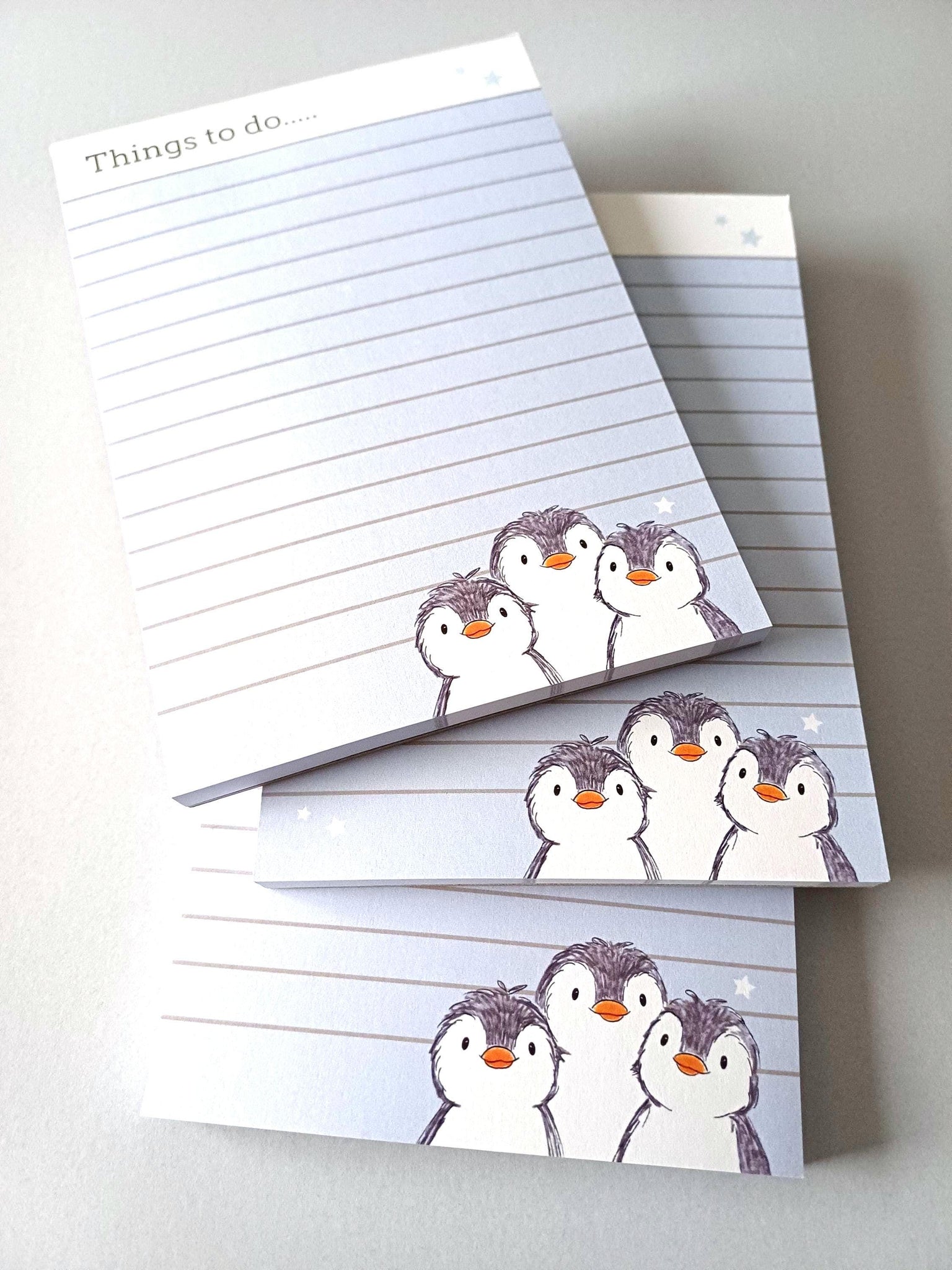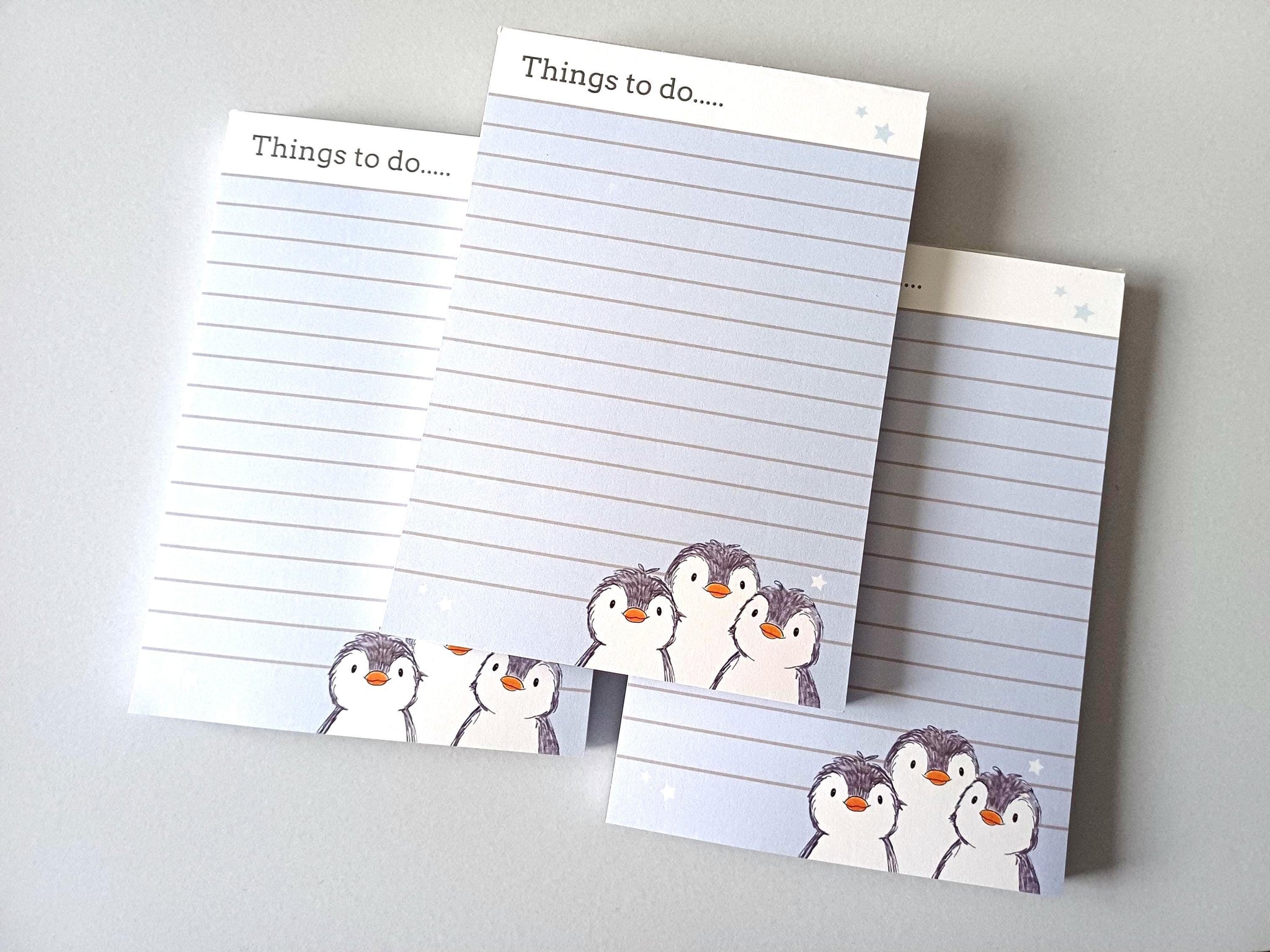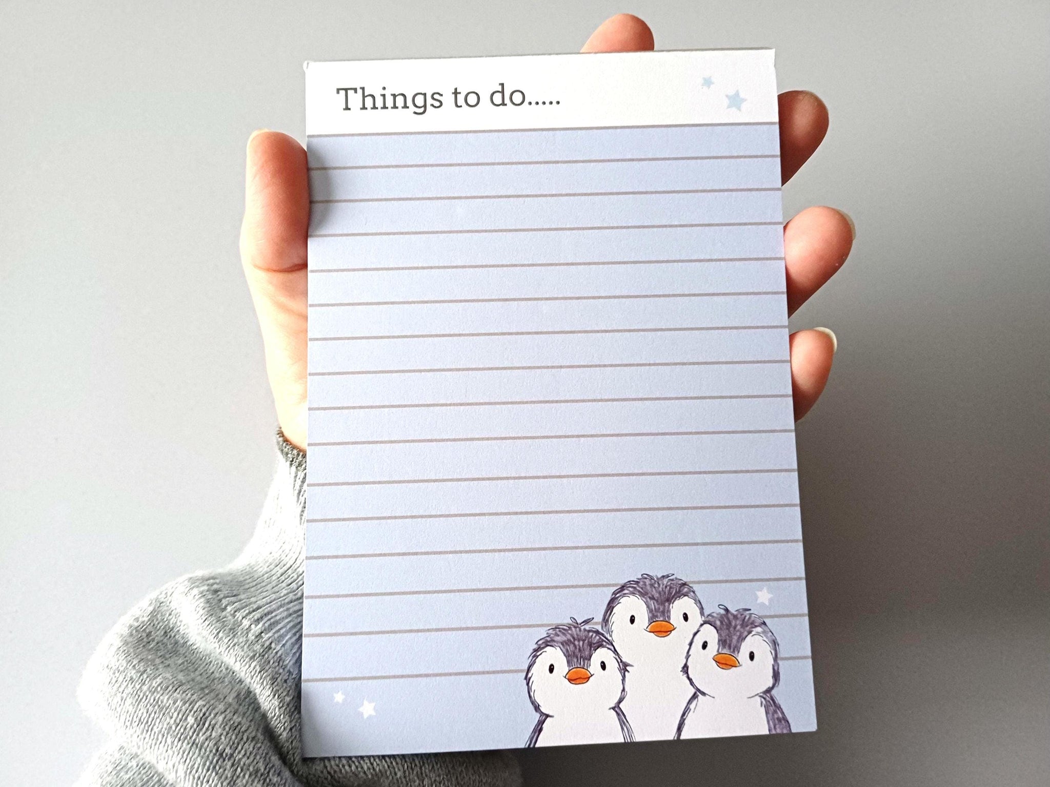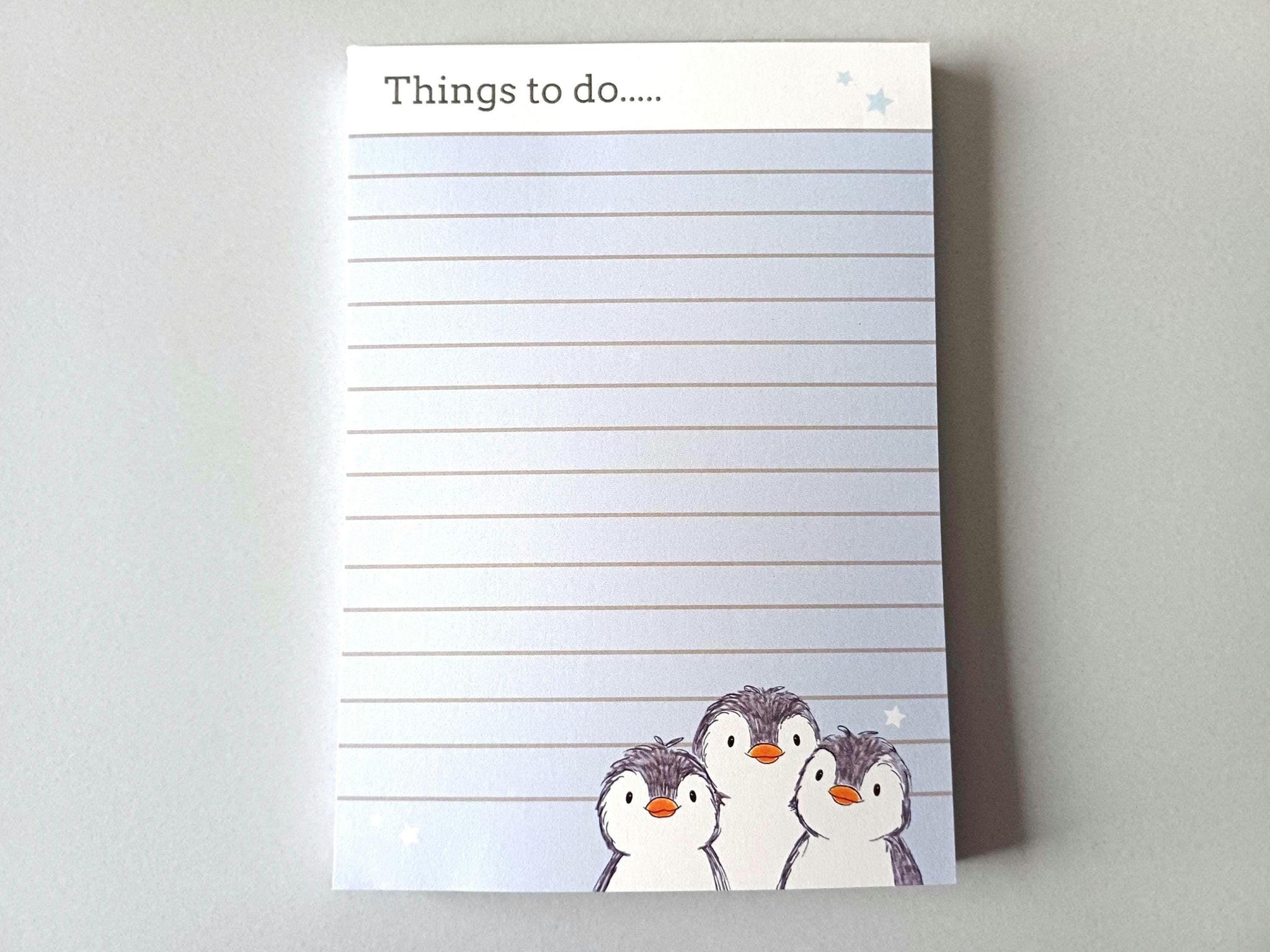 A small blue and white jotter, with a penguin design in the bottom corner.
