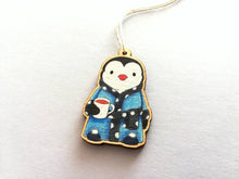 Little wooden penguin in a dressing gown Christmas tree ornament.
