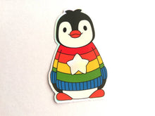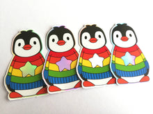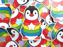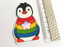 The penguin is black and white in a rainbow striped jumper. The star is holographic rainbow colours that change when viewed from different angles.