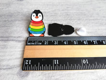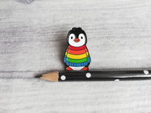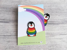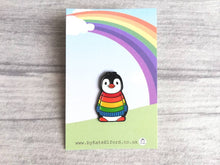 Boo the penguin wearing a rainbow jumper enamel pin.