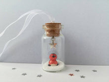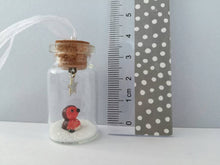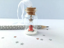 Miniature hand crafted ceramic Christmas robin ornament. Little robin is sealed in a glass bottle and has a silver colour star hanging above.