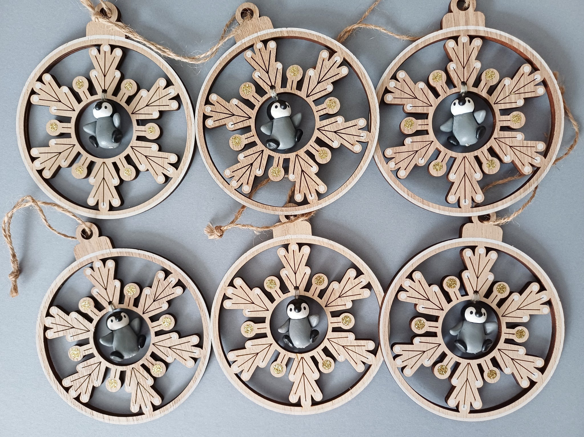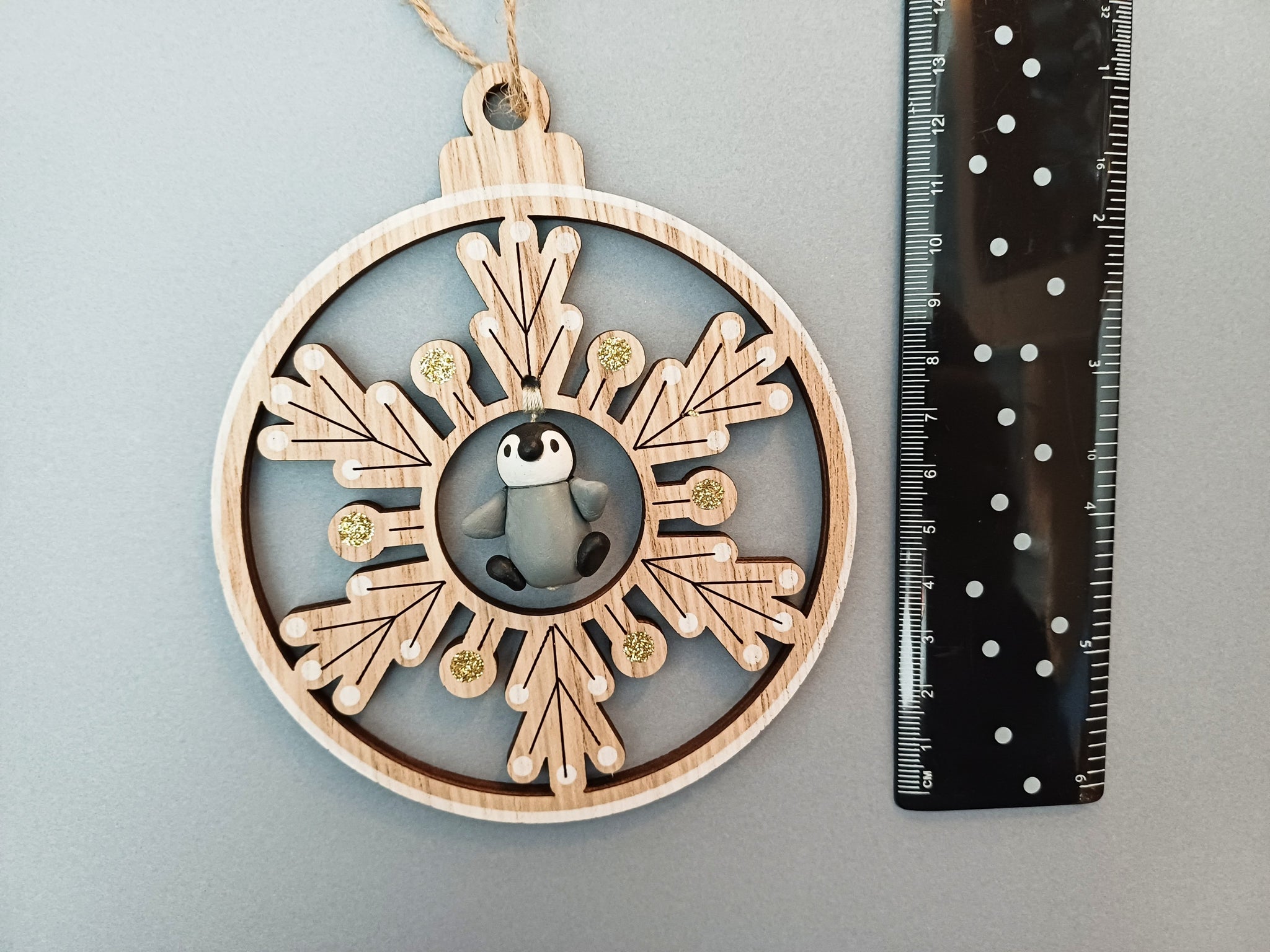 This is a very small penguin, only measuring around 3cm tall and it is attached in a wooden snowflake which measures approximately 13cm tall.